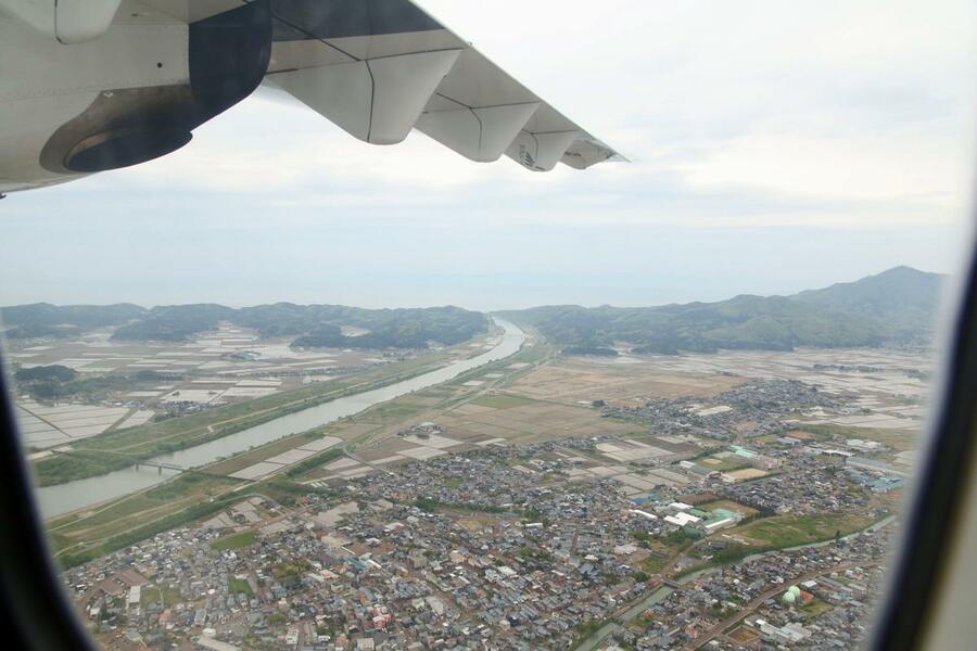 新潟空港から信濃川沿いの上空を進み、県央地域で旋回し、佐渡を巡って戻る45分ほどのフライト。窓からは鏡のような水田が一面に広がり、弥彦山や大河津分水、寺泊港が見渡せた。世界文化遺産「佐渡島(さど)の金山」のシンボルである「道遊の割戸」も確認できた。