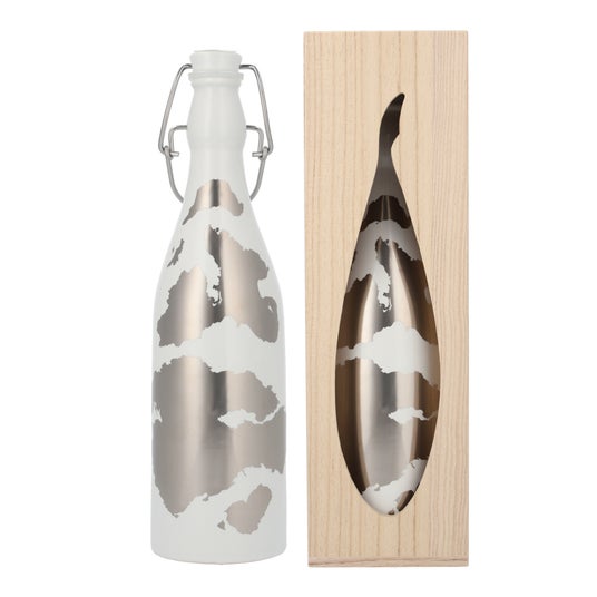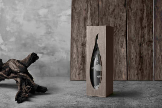 錦鯉のシルエットがくり抜かれた桐箱は、200年の伝統をもつ桐箪笥の産地として有名な新潟県加茂市製。桐の柔らかい質感が滑らかな瓶と見事に調和しています。