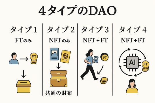 - DAOの多様な形態: FT活用型、NFT活用型、NFTとFTの組み合わせ型はもちろん、本リサーチペーパーの視点として、AIによる自動化や効率化を取り入れたコミュニティ運営モデルを紹介。
