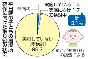 平日の朝に子どもの居場所確保に向けた取り組みを「実施している」と答えた自治体は1・4%に当たる14、「実施に向けて検討中」は1・7%の17だった。対して「実施していない(未検討)」は96・7%の9...