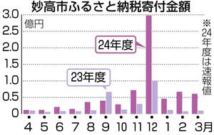 妙高市の2024年度のふるさと納税寄付額が約7億200万円となり、過去最高だった23年度の2億8077万円の2・5倍となった。このうちコメの返礼品が4・3倍の約2億7600万円となり、全体の4割を占めた。昨夏以来の全国的なコメ不足を背景に返礼品のコメに人気が集まった。全体の寄付件数も約6800件増の約1万9千件で過去最多となった。