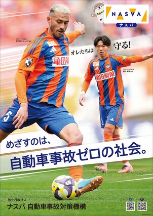 新潟のセンターバックとして守備の中核を担う舞行龍と稲村。ポスターでは2人のプレー写真とともに「オレたちは守る!」「めざすのは、自動車事故ゼロの社会。」とPRしている。ポスターはB2判、クリアファイルはA4判。