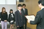 感謝状を受け取る第四北越銀行松浜支店の(左から)坂井ひかるさん、佐藤藍さんら=新潟市北区松浜本町2