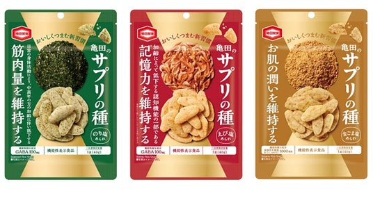 『亀田のサプリの種』は、亀田製菓が創業以来培ってきたお米の加工技術力を活かし、従来の米菓にはない新たな健康価値を付与した機能性表示食品の米菓です。記憶力※・筋肉量・肌の潤いといった健康維持成分を、素材のおいしさとともに手軽に摂取することができます。米菓と相性の良い素材を組み合わせることで、飽きずに一袋を食べきれるシンプルな味わいに仕上げています。それぞれ、えび・のり・金ごまをたっぷりとお米の生地に練り込むことで、1粒にぎゅっと素材のおいしさを閉じ込めました。また形状・食感にもこだわり、つまみやすい一口形状に成型し、噛みしめる食感に仕上げています。