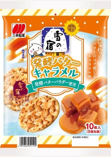 今回新たに登場した「雪の宿 発酵バターキャラメル」は、よりコク深く特有の風味が感じられる発酵バターパウダーを使用しました。濃厚なキャラメルの甘さと発酵バターの風味をお楽しみいただける、いつもの「雪の宿」より少しリッチな「雪の宿」です。濃厚でクリーミーなバターキャラメルの味わいとおせんべいのほどよい塩味が調和した、奥深い味わいをお楽しみいただけます。