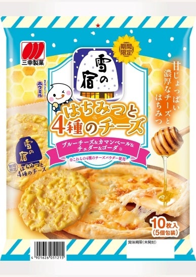 4種のチーズの塩味とはちみつの濃厚な甘味が絶妙に調和した「雪の宿」です。ブルーチーズ、カマンベールチーズ、チェダーチーズ、ゴーダチーズの4種のチーズパウダーを使用して、奥深いチーズの香りを感じられる贅沢な味わいを表現。さらにそこにはちみつを合わせた、まるでクアトロフォルマッジを思わせるような奥深く贅沢な甘じょっぱさをお楽しみいただける一品です。