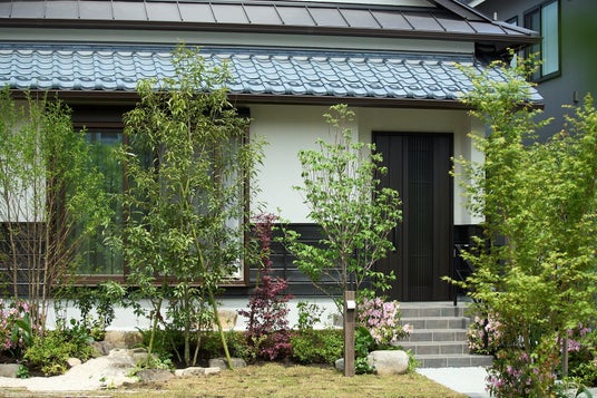 外構には、玄関へと続く緑豊かなアプローチ、広がる芝生、そして四季折々に表情を変える植栽を施した庭が広がります。日々の暮らしの中に、季節のうつろいや時の流れを感じるひとときが生まれます。