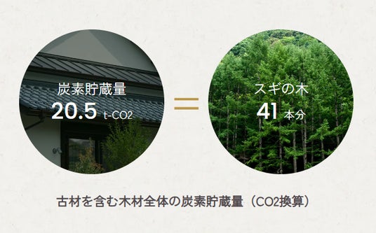 「古材」の利用を通じ、廃棄物削減やCO2の排出抑制につながり、循環型社会の形成を推進します。なお、本モデルハウスで用いた古材を含む木材全体の炭素貯蔵量 は、杉の木換算で41本分に相当します(林野庁「建築物に利用した木材の炭素貯蔵量の表示ガイドライン(令和3年10月1日付)」に基づき計算)。