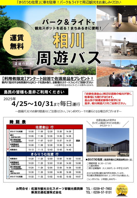 佐渡金山を中心とした世界遺産関連施設を効率よく巡りたい方に朗報!2025年4月25日(金)から10月31日(金)までの期間中、「相川周遊バス」が毎日運行されます。
