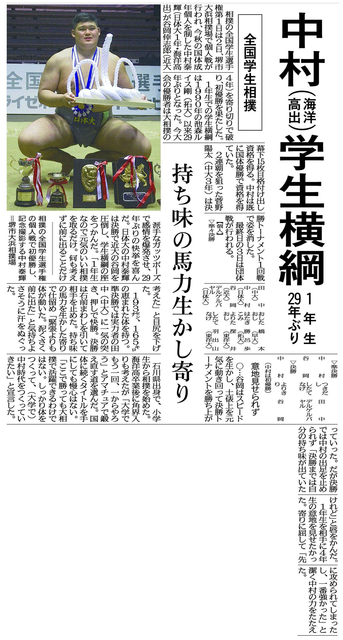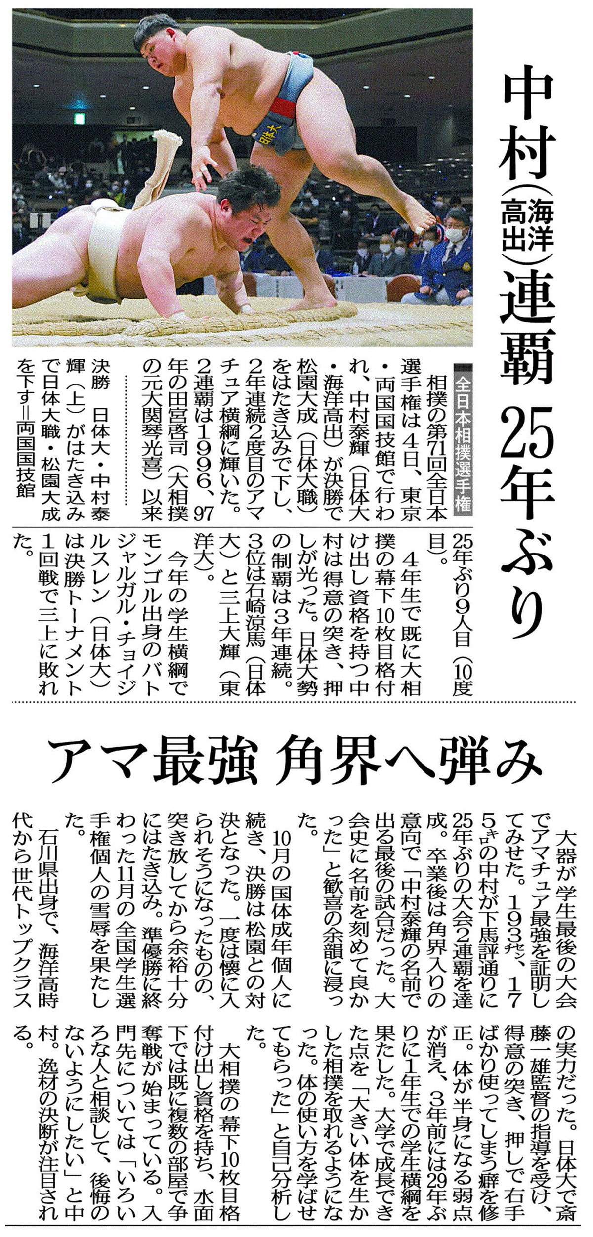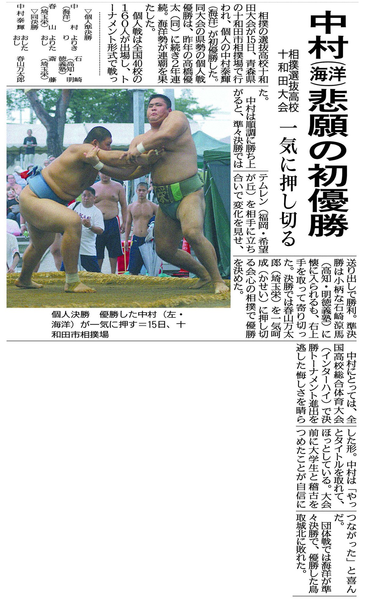 学生横綱1回、アマ横綱2回-。新潟日報は「アマ最強 角界へ弾み」という見出しで大器の可能性を伝えた。「中村泰輝の名前で出る最後の試合だった。大会史に名前を刻めて良かった」と歓喜の余韻に浸ったという。