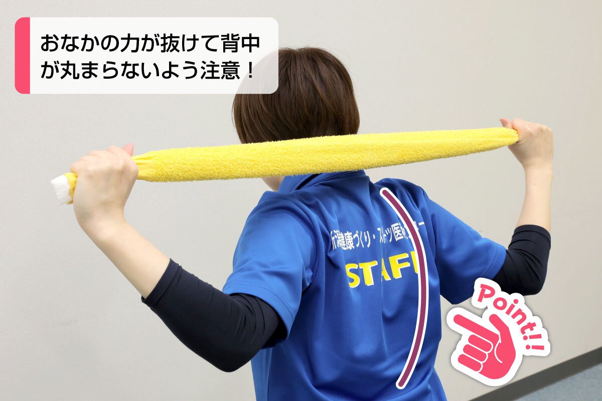 (1)椅子に浅く腰かけて、タオルの両端をつかむ。両手を上げてタオルを引っ張って持ち、おなかに力を入れて姿勢を真っすぐに保つ。少し上半身を前傾にする。目線は斜め前、遠くを見る。