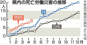 労働局によると、死亡労働災害は全国的に減少傾向だが、県内では24年が前年比6人増の20人で、今年はさらに発生のペースが早い=グラフ参照=。