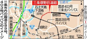 国道403号は24年3月に三条北バイパスが全線開通。同月に開院した済生会新潟県央基幹病院(三条市上須頃)への救急搬送のルートになっている。三条市内で計画されている国道289号バイパス、石上大橋下流橋(仮称)に接続する三条塚野目道路の区間が開通することで、現行よりスムーズに救急搬送ができるようになると期待...