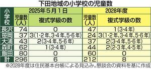 下田地域の小学校は長沢小、笹岡小、大浦小、森町小、飯田小の5校。五つの小学校の児童数は、ことし5月1日時点で計296人で、住民基本台帳による見込みでは28年度には計212人に減少。4小学校で複式学級ができる見通しだ。