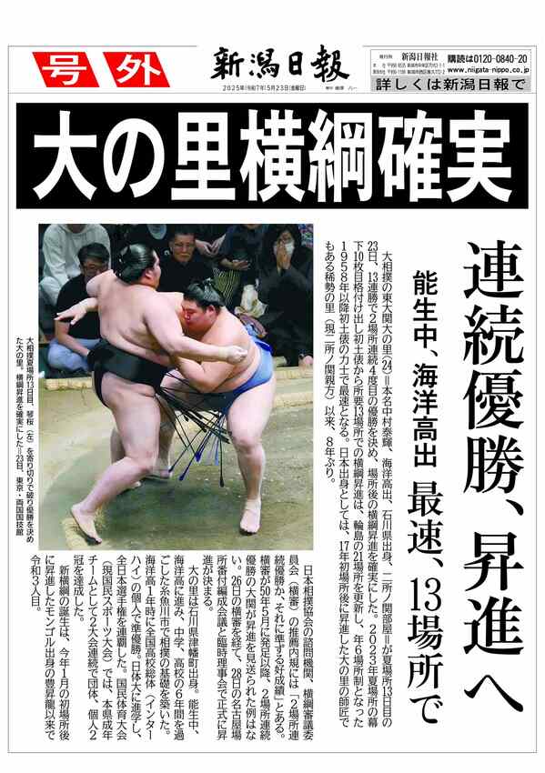 【号外】大の里が2場所連続優勝、横綱確実 2025/5/23 18:25 (最終更新: 2025/5/23 18:26) PDFで号外を見る トップページで最新情報を見る 関連ニュース 【号外】新潟県知事が柏崎刈羽原発再稼働を容認 11/21 【号外】日経平均初の5万円台 10/27 【号外】新首相に高市早苗氏、女性で初めて選出 10/21 【号外】燕市の新市長に前市議の佐野大輔氏 10/20 【号外】北信越高校野球・帝京長岡が優勝 10/19 【号外】公明党が連立政権離脱へ 10/10 【号外】ガザ全人質解放へ 10/9 【号外】ノーベル化学賞に北川進京都大特別教授 10/8 ノーベル化学賞に京都大特別教授の北川進氏ら 10/8 【号外】ノーベル生理学・医学賞に大阪大栄誉教授の坂口志文氏ら3氏 10/6 【号外】自民党新総裁に高市早苗氏 10/4 【号外】石破茂首相が辞任の意向 9/7