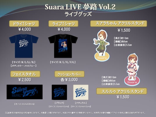 ライブ会場において、「Suara LIVE 夢路 Vol.2」のライブグッズを販売しております。