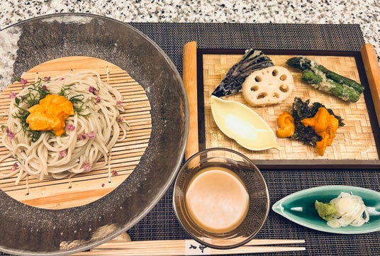 (イメージ)・更科蕎麦エゾバフンウニ乗せ/キタムラサキウニ入り蕎麦出汁・天麩羅/岩海苔のかき揚げ エゾバフンウニ添え 等
