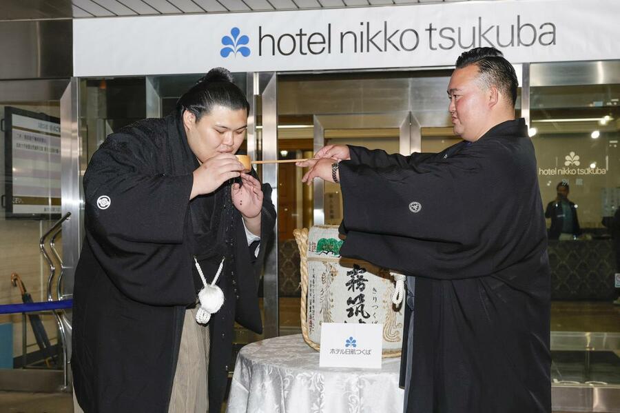 祝勝会会場に到着し、二所ノ関親方(右)から水をつけてもらう大の里=25日、茨城県つくば市内のホテル