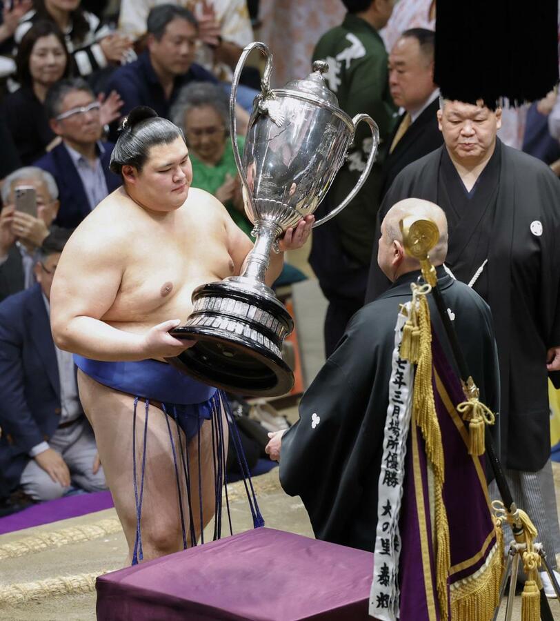 内閣総理大臣杯を受け取る大の里=両国国技館(代表撮影)
