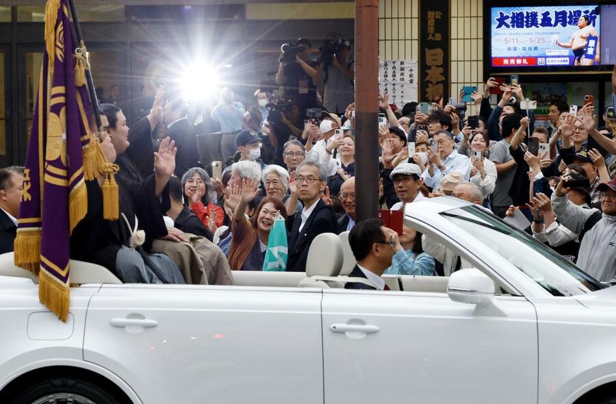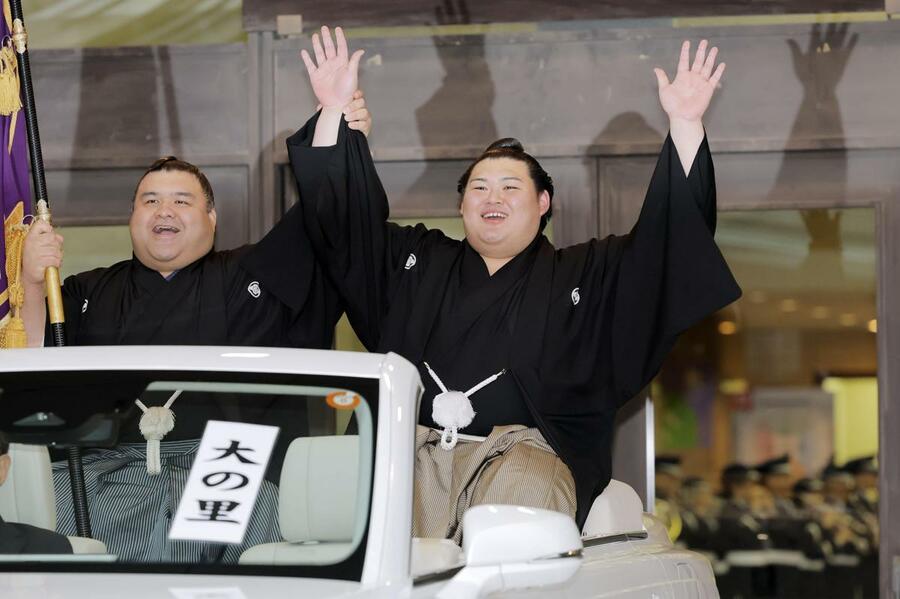 大相撲夏場所で優勝し、パレードで手を振る大の里(右)=25日、東京・両国国技館