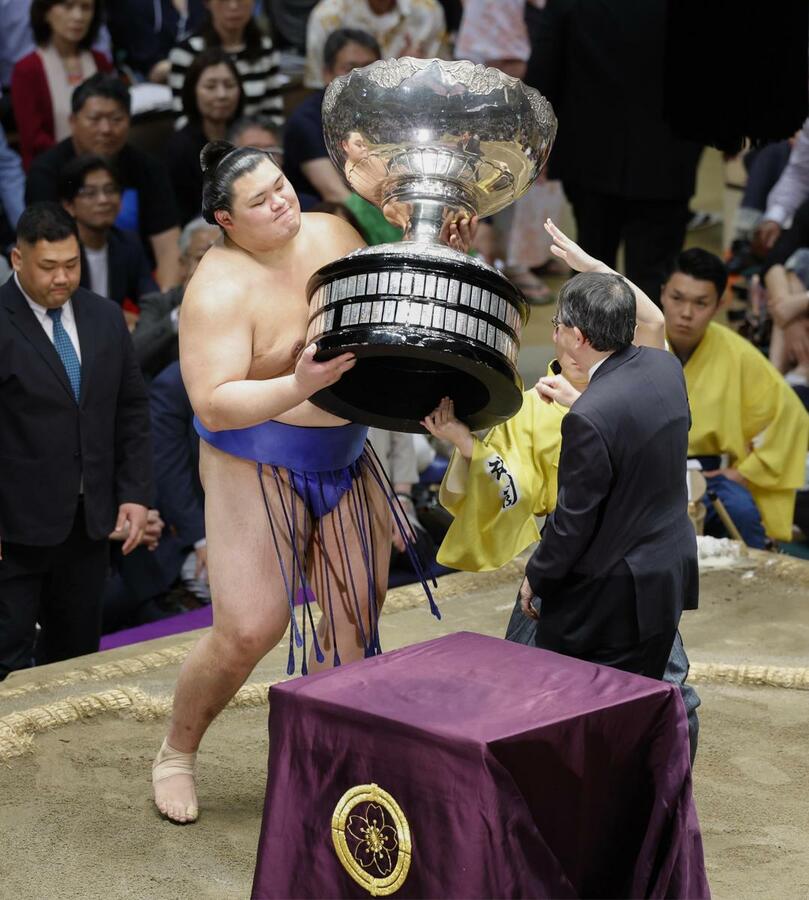 大相撲夏場所で優勝し、賜杯を手に喜ぶ大の里=25日、東京・両国国技館(代表撮影)