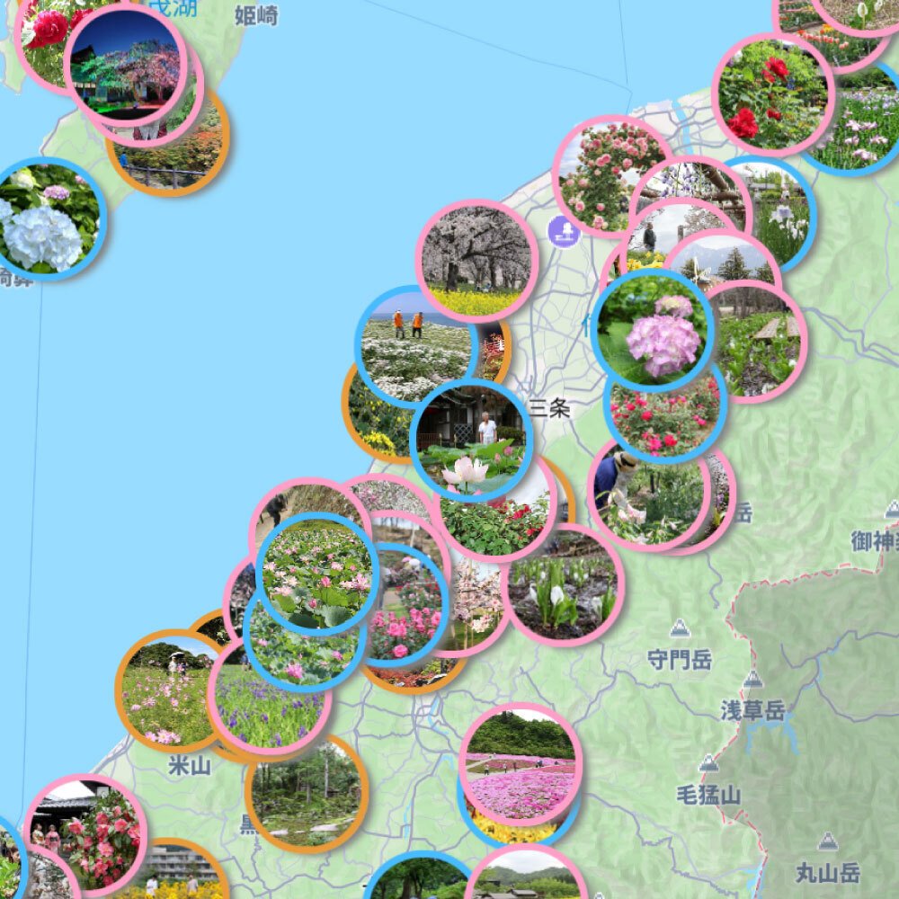今どこに行けば、どんな花が楽しめる…?新潟日報デジタルプラスでは、新潟県内の「花スポット」を地図にまとめています。上の地図や「入り口」をクリックすると「花マップ」が表示され、花が咲いている場所や過去記事へのリンクをご覧いただけます。