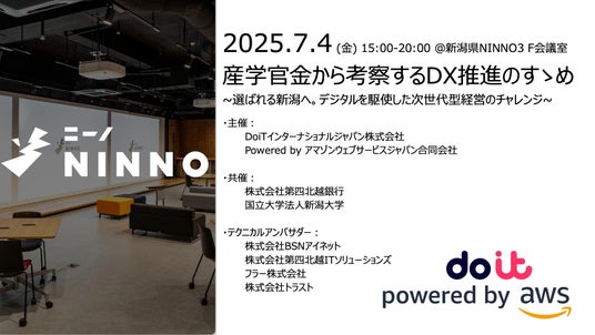 AWSの最上位パートナーであるDoiTインターナショナル・ジャパン株式会社(登記:東京都港区赤坂1-11-44、代表取締役:ヴァディム・ソロヴェイ)は、アマゾンウェブサービスジャパン合同会社(以下「AWS」)と新潟県にゆかりの深い企業・団体のご協力のもと、新潟県におけるデジタルトランスフォーメーション(以下「DX」)推進イベント「産学官金から考察するDX推進のすゝめ」を開催します。