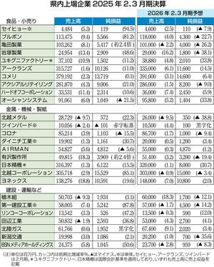 県内上場企業(銀行除く26社)の2025年2、3月期決算が26日までに出そろった。原材料や仕入価格の上昇分を販売価格に転嫁する動きが浸透するなどし、8割超の22社が前期に比べて増収となった。純損益も22社が改善(増益21社、黒字転換1社)し、過去最高益の企業もあった。