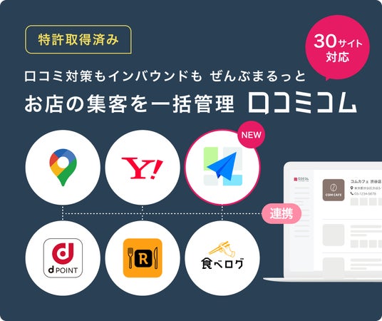 口コミコムは、国内外の口コミサイトを”もっと”売上に変える「店舗向け集客一元化プラットフォーム」です。