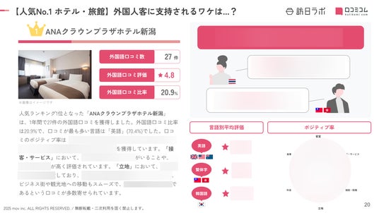 業界最大級のインバウンドビジネスメディア「訪日ラボ」及び 店舗向け集客一元化プラットフォーム「口コミコム」を運営する株式会社mov(代表取締役:渡邊 誠、本社:東京都渋谷区、以下mov)は、新潟県のホテル・旅館に寄せられた最新の口コミデータから、独自の『インバウンド人気ホテル・旅館ランキング』を発表しました。
