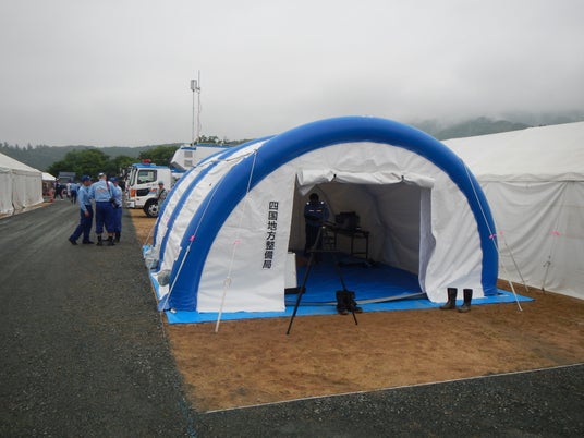 マク・クイックシェルターは、緊急・災害時に素早く簡単に設営できるハイブリッドエアーテントです。女性4人で10~15分で設営が可能で、災害対策本部や救護所をはじめとする幅広い用途に即応力を発揮します。東日本大震災や令和6年能登半島地震など、災害時の医療用途などを含めて2700張り以上の活用実績があります。