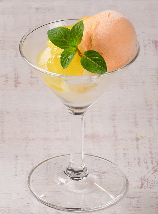 ちょこっとデザートを食べたい方に。優しい甘さのバニラアイスと濃厚な北海道赤肉メロンアイスに、瀬戸内レモンジュレを添えました。レモンの爽やかさで、食後でもさっぱりと食べられます。