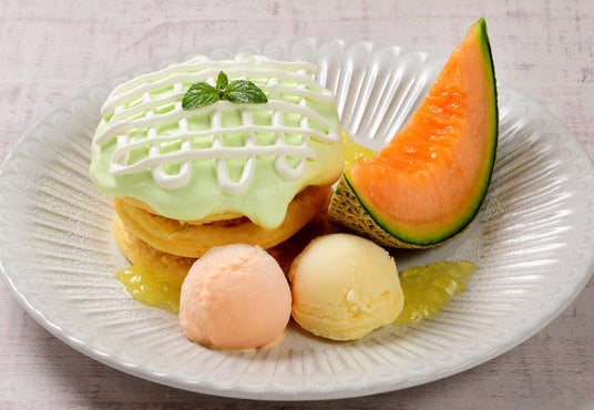 パンケーキの生地には食感の違いを楽しんでいただけるよう、ココナッツの果肉を細かく削って乾燥させたココナッツロングを加えました。しっとり焼き上げたパンケーキに、レアチーズムースと瀬戸内レモンジュレをサンドし、上にはメロンに見立てたクリームをたっぷりとトッピング。そこに大きくカットしたジューシーなフレッシュメロンと、北海道赤肉メロンアイスを添えて贅沢な一皿に仕上げました。メロンやアイスと一緒に食べるのがおすすめです。