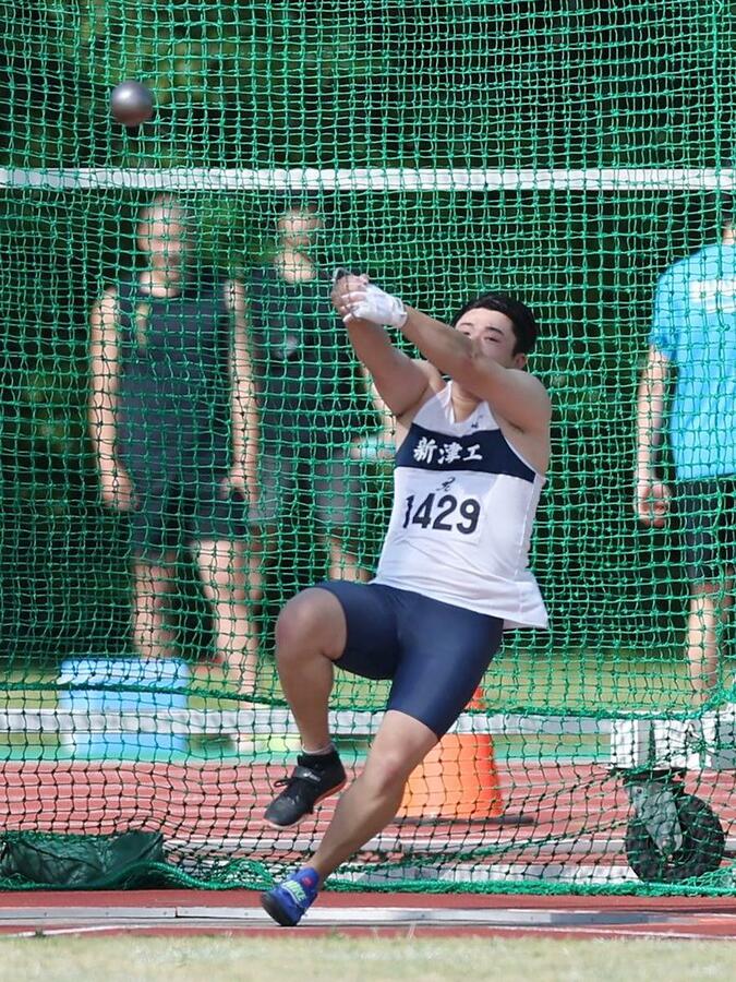 男子ハンマー投げ決勝 優勝した中川冬夢(新津工)=29日、新潟市中央区清五郎のスワンフィールド