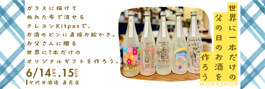 ガラスに描けてぬれた布で消せるクレヨンkitpasで、お酒のビンに直接お絵かき。お父さんに贈る、世界に1本だけのオリジナルギフトを作ろう。