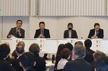 部活動の地域移行に向けて語り合う室伏広治さん(中央左)と栗山英樹さん(中央右)=長岡市千秋3