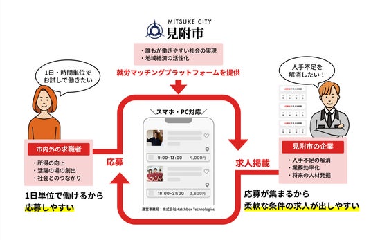 当社は1日・数時間単位の求人と働き手をオンラインでマッチングする自治体公式就業プラットフォーム「自治体公式マッチボックス(https://business.matchbox.jp/government)」の構築・運用をサポートしています。見附市が開設する「みつけマッチボックス」では、利用企業が見附市を就業地とした求人を無料で掲載でき、Webサイトおよびアプリケーション上に集約された求人には、見附市内の求職者を中心に全国から閲覧・応募が可能です。