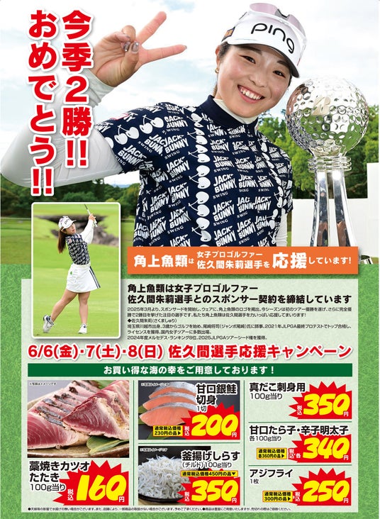 角上魚類ホールディングス株式会社(以下、角上魚類)では、スポンサー契約を締結している女子プロゴルファー佐久間朱莉選手の今季2勝目を祝し、応援キャンペーン第二弾を行います。