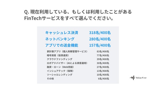 デジタルマーケティングの株式会社バリューファースト(本社:神奈川県横浜市、代表取締役:佐野 聡士、以下バリューファースト)が運営する「ゼニエモン」では10代以上の男女400名を対象に、FinTechサービスの利用実態と普及率についてアンケートを実施しました。