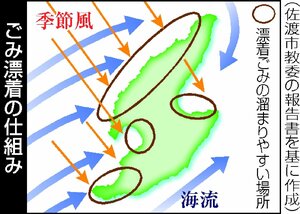 佐渡の海岸に漂着ごみが多いのはなぜか。市ジオパーク推進室の相田満久さん(58)が10年ほど前、2年かけ要因を調査した。