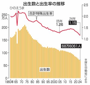 社会 2024年の出生数、初の70万人割れ…合計特殊出生率1・15で過去最低、少子化は政府推計より15年早く進行 2025/6/5 9:45 2024年に生まれた子どもの数(出生数)は68万6061人で、1899年の統計開始以降初めて70万人を割り込んだ。23年比4万1227人(5・7%)減。全都道府県で減少した。女性1人が生涯に産む子どもの... 残り1569文字(全文:1671文字) ここから先を読むには 続きを読む(会員登録する) 続きを読む(ログイン) 新潟日報朝刊を購読していますか? はい いいえ トップページで最新情報を見る 関連ニュース 止まらぬ少子化…新潟県人口に占める子どもの割合&人数ともに4... 5/5 重川県議の記者暴行「極めて卑劣」新聞労連が抗議声明 21:25 息子など名乗り2300万円だまし取った疑い、東京の男を逮捕 ... 21:15 「油断避けるため」新発田市、11日の緊急銃猟を報道発表せず ... 20:50 小千谷の養鯉池、鯉食べるクマを目撃 20:17 鉄道の信号設定ミス、全国10事業者15駅で判明 県内ではJR... 20:00 信濃川の大河津分水路改修の促進要望 新潟市長ら3市長が国交省... 20:00 冬告げる恒例カレンダー「グラフで見る雪の高田」、17日から配布 19:35 知人女性の自宅から現金508万円盗んだ疑い、新潟市北区の男を逮捕 19:30 北陸4県の農協と自民党国会議員が懇談会 コメの供給過剰懸念を... 19:30 高齢者になっても心身充実を 17日に長岡でシンポ、生きがいづ... 19:00 鳥インフルのまん延防止へ、県内95養鶏場に消毒命令 県が発令... 18:15