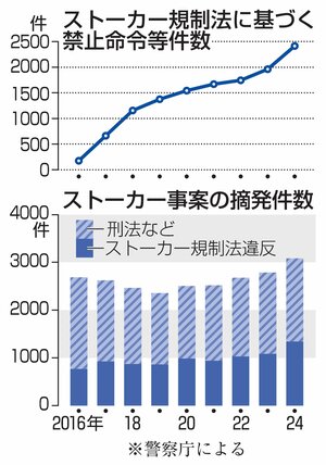 社会 ストーカー規制法違反での摘発1341件、禁止命令等2415件でともに過去最多「ためらわずに相談を」 2025/6/15 12:20 2024年のストーカー規制法違反での摘発件数は1341件(前年比260件増)、同法に基づき、つきまといなどの行為をやめさせる行政措置「禁止命令等」の件数も2415件(同452件増)となり、いずれも00年... 残り1020文字(全文:1122文字) ここから先を読むには 続きを読む(会員登録する) 続きを読む(ログイン) 新潟日報朝刊を購読していますか? はい いいえ トップページで最新情報を見る 関連ニュース 阿賀町で車がクマと衝突、運転手にけがなし 9:45 クマとみられる足跡、三条市の事業所で玄関ドアガラス割られる 11/4 女子中学生にわいせつ行為し撮影疑い 新潟市立中教諭3回目逮捕 11/4 阿賀野市倉庫にクマ立てこもり、安全優先で麻酔銃使用 資格者待... 11/4 護衛艦「みょうこう」、クマ出没情報のため、新潟東港での公開イ... 11/4 新潟市水道局が上下水道の使用料を誤徴収 14年間で103万円 11/4 特殊詐欺電話の「かけ子」勧誘疑い 広島市の男を再逮捕 11/4 草刈り作業中に石が飛び中学生けが 魚沼市が60代職員を戒告処分 11/4 上越市で納屋全焼、けが人なし 11/4 「新潟国際アニメーション映画祭」が正念場、運営主軸が名古屋に... 11/4 満足度の高い「高校受験の塾」新潟県ランキングを発表!個別指導... 11/4 ビニールハウスや車…避難所以外で生活送る被災者への支援強化 ... 11/4