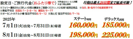 ・新日本海フェリー往復乗船代(ステートまたはデラックス)