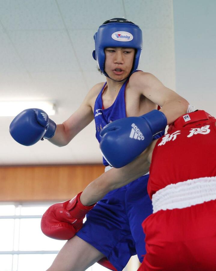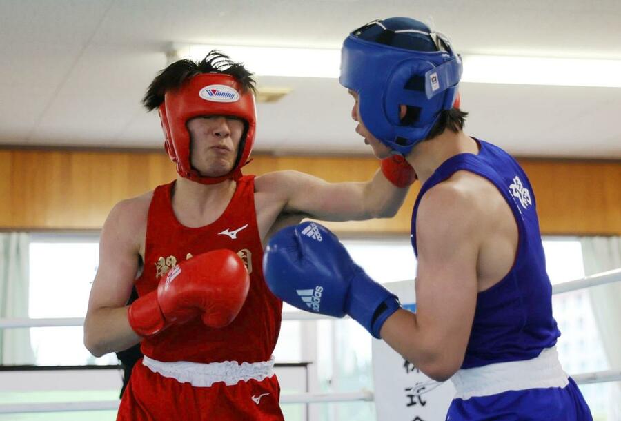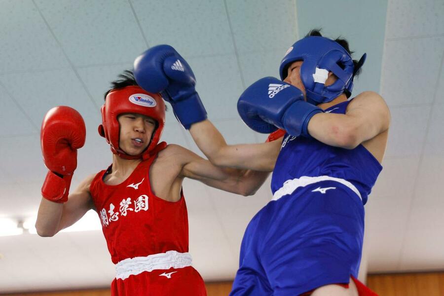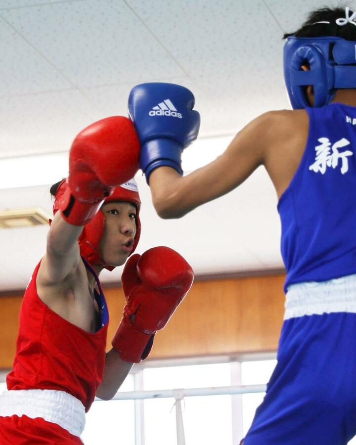 男子バンタム級決勝 右を放つ開志学園の三國成(右)=新潟南高