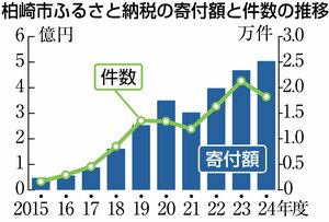 柏崎市の2024年度のふるさと納税寄付額が前年度比7・7%増の5億424万円で、22年度から3年連続で過去最高を更新した。市は返礼品を提供する事業者の増加や、米価高騰で返礼品のコメの引き合いが高まっていることが寄付額を押し上げたとみている。