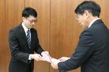 柏崎工業高の生徒の活躍を期待して寄付金を手渡した品田電業社の品田史夫社長(左)=柏崎市栄町5