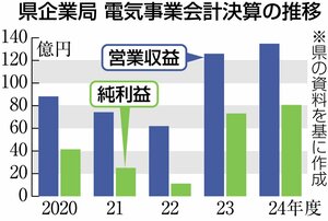 水力、太陽光の発電事業を手がける県企業局は12日までに2024年度電気事業会計決算を発表した。水力発電の売電単価が上振れし、営業収益は前年度比7・0%増の134億8179万円で過去最高。経費などを差し引いた純利益も10・2%増の80億6307万円となり、過去最高だった。