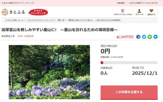 新潟県田上町とふるさと納税ポータルサイト「さとふる」を運営する株式会社さとふる(本社:東京都中央区、代表取締役社長 兼 CEO:藤井 宏明)は、「さとふるクラウドファンディング」にて、「護摩堂山を親しみやすい里山に! ~里山を訪れるための環境整備~」の寄付受け付けを2025年6月13日より開始します。