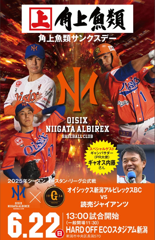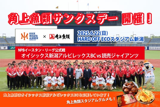 2025年6月22日(日)に開催されるNPBイースタン・リーグ公式戦【オイシックス新潟アルビレックスBC vs 読売ジャイアンツ】は、「角上魚類サンクスデー」として開催されます。オイシックス新潟アルビレックスBCファンのみなさま、そして地域の皆様に、よりプロ野球を楽しんでいただけるよう、角上魚類も力いっぱい応援してまいります。