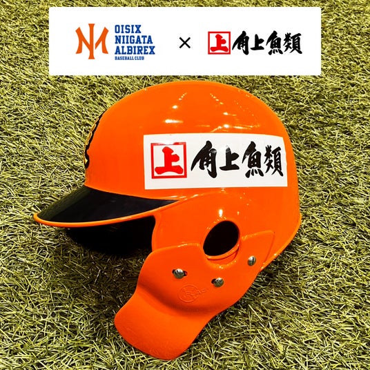 オイシックス新潟アルビレックスBCの試合用公式ヘルメット 左サイドに角上魚類のロゴを掲出頂いています。戦う選手たちと共に角上魚類はバッターボックスの中におります!